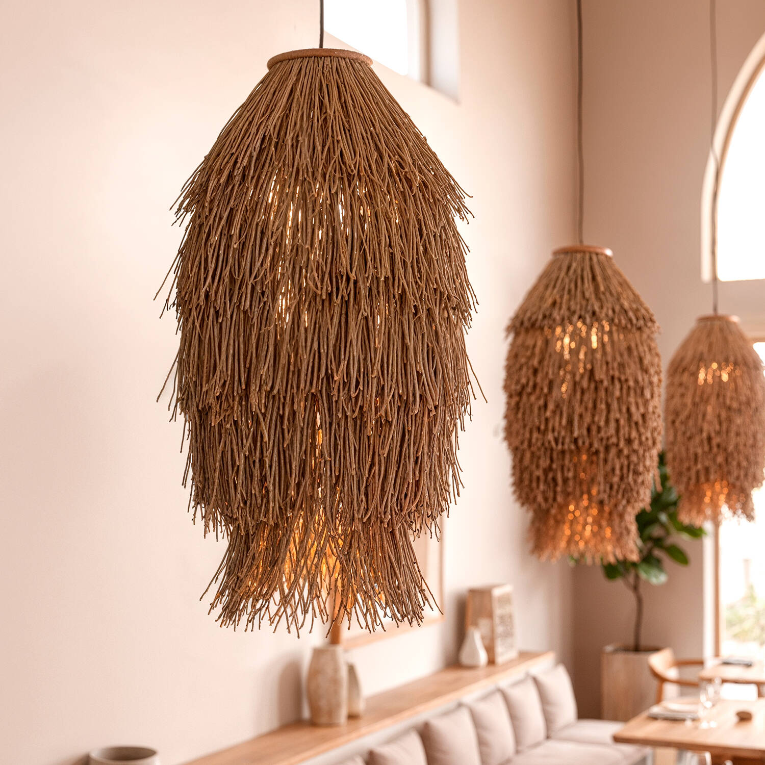 La Suspension Fibres Naturelles Extérieure Ramé réinvente l’éclairage extérieur avec une silhouette artisanale et des matériaux d’inspiration naturelle. Conçue pour les espaces extérieurs et les suspensions extérieures raffinées, elle apporte une atmosphère chaleureuse et organique aux terrasses, patios, restaurants et salons couverts.