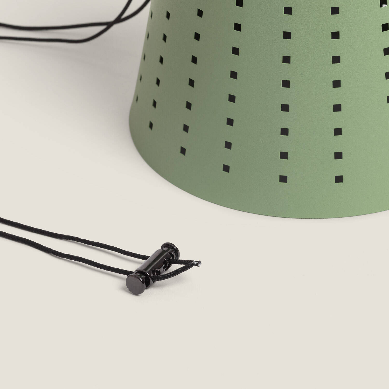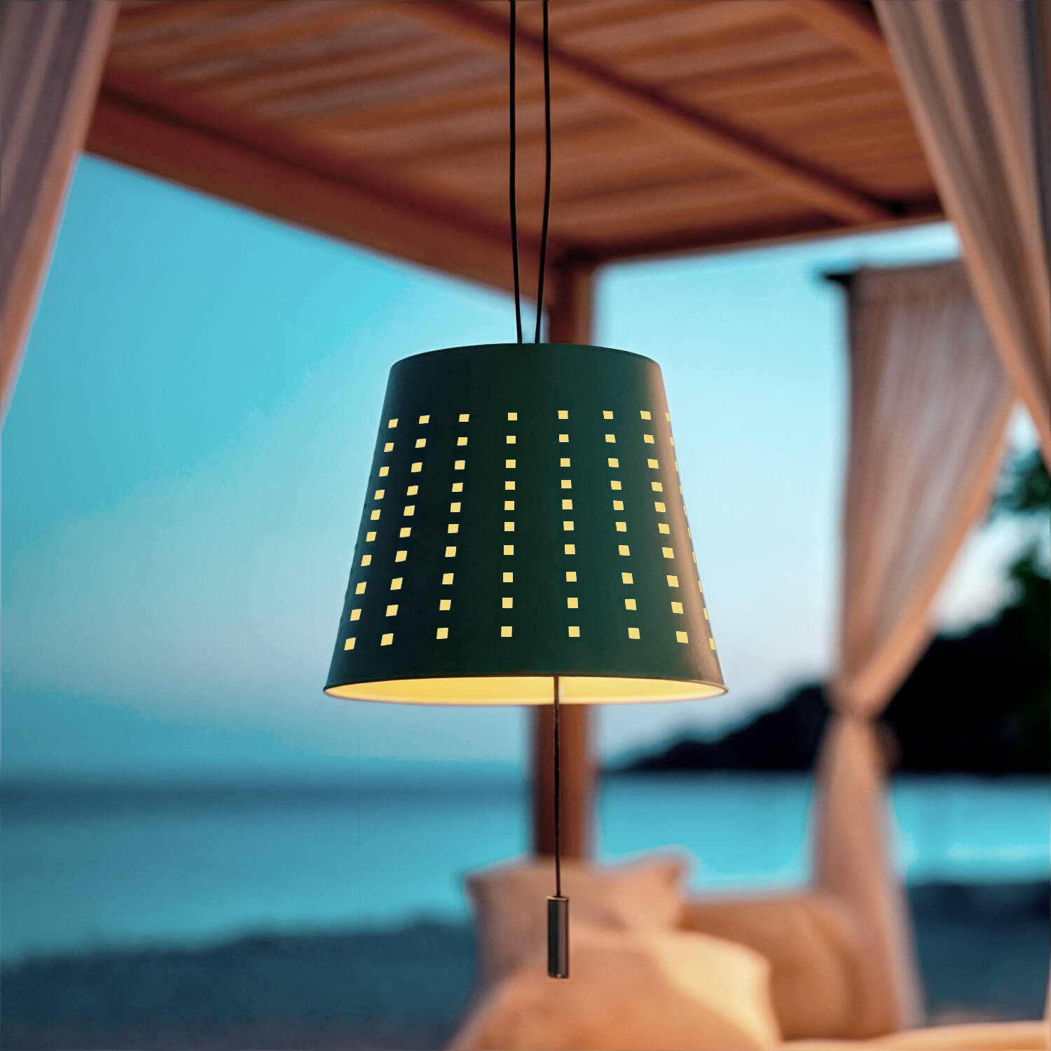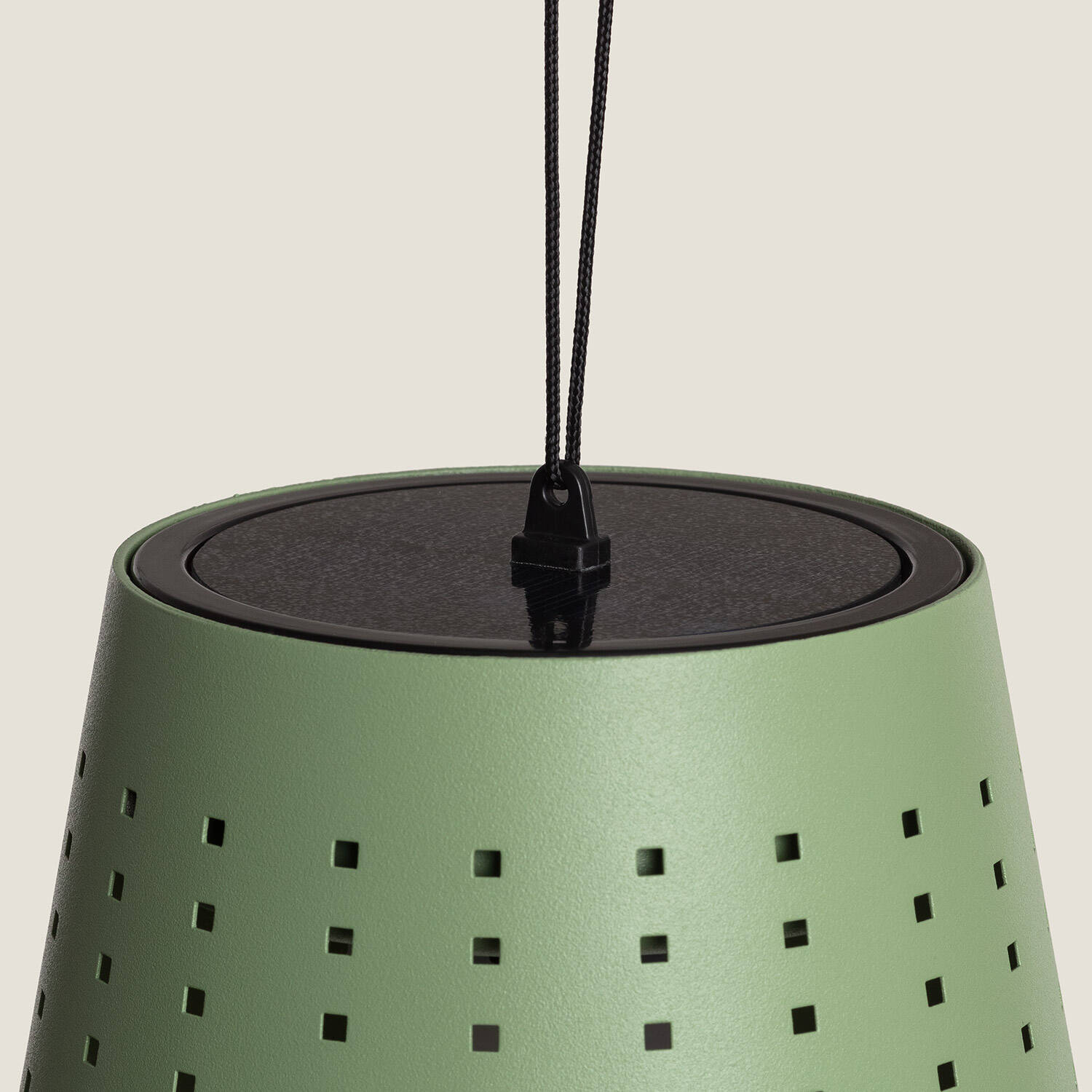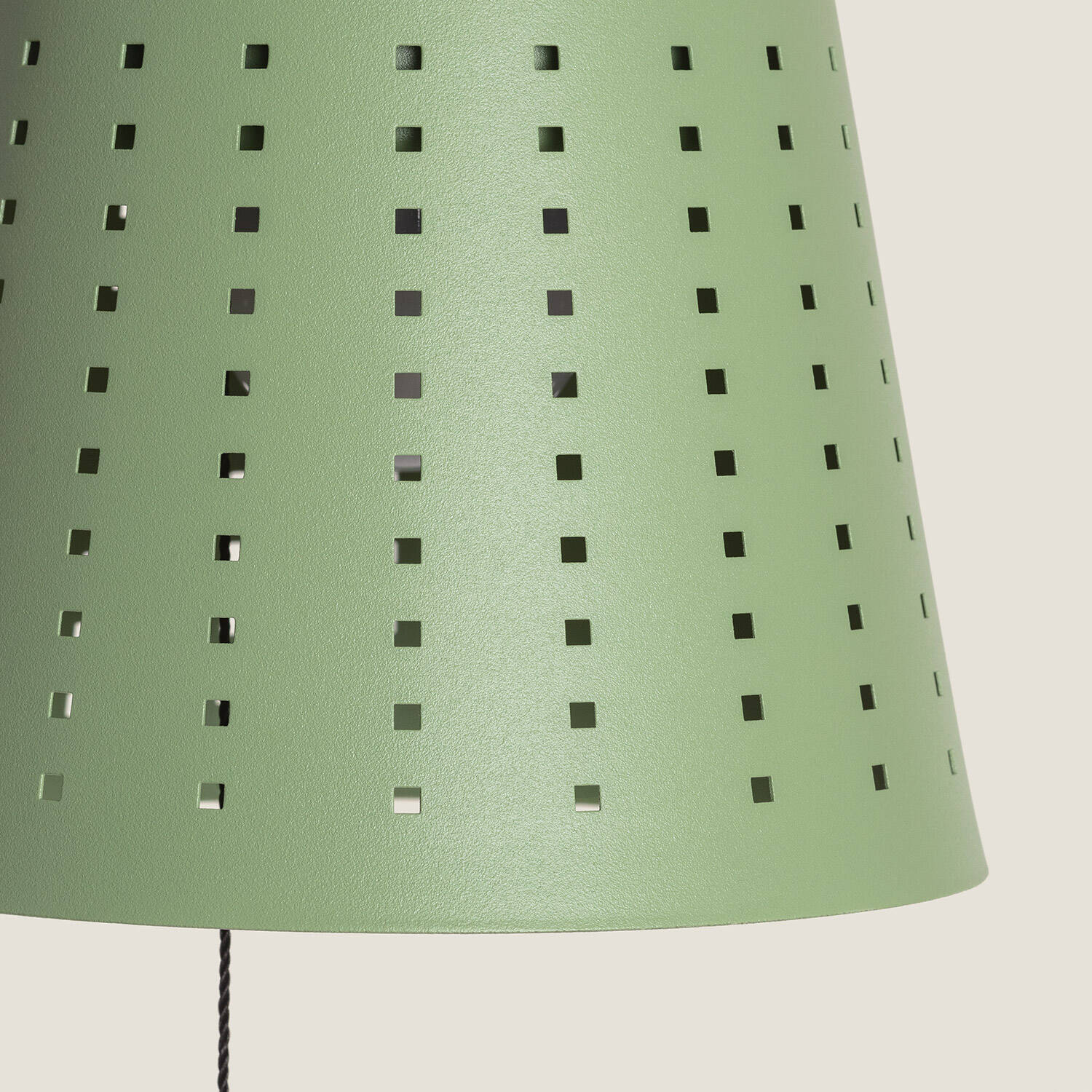 La silhouette conique percée de motifs réguliers diffuse une esthétique contemporaine et délicate. Le corps en métal couleur vert céladon crée une présence discrète et chaleureuse, idéale pour un décor extérieur soigné où l’éclairage devient à la fois fonctionnel et ornemental.