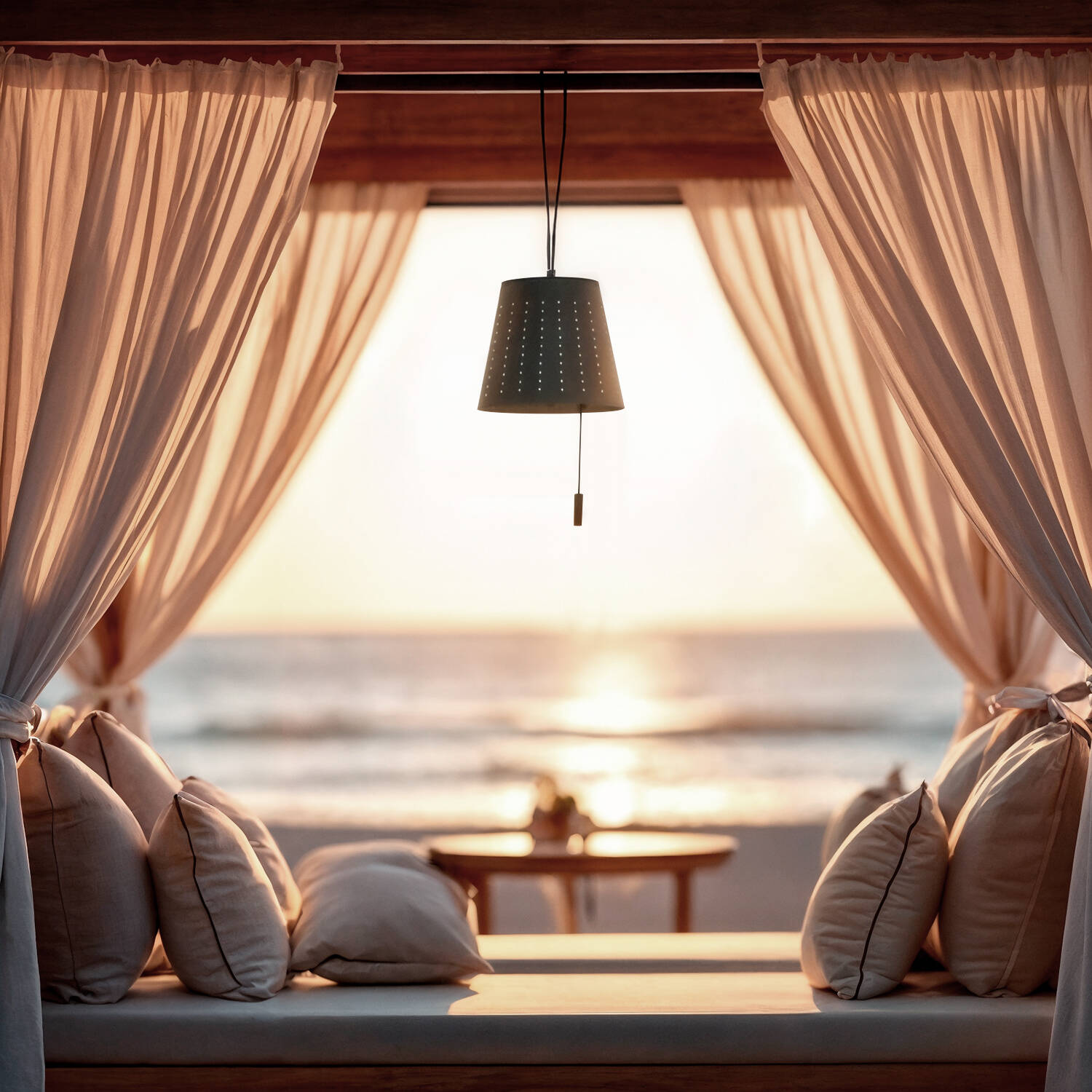 Suspendre la lampe à un crochet solide ou à une poutre grâce au câble de suspension de 1000 mm. L'installation ne demande pas de câblage électrique car le luminaire fonctionne sur batterie rechargeable solaire et classe d'isolation III assure un fonctionnement basse tension. Prévoyez une fixation adaptée au poids et à l'environnement extérieur.
