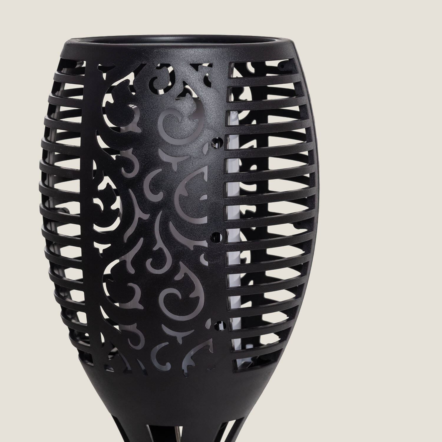 La torche reproduit fidèlement l’animation d’une flamme grâce à 96 LED programmées pour créer des variations lumineuses et un mode « flamme » animé. Un mode « normal » permet une lumière stable ; la source lumineuse est remplaçable, prolongeant la vie du produit sans remplacement complet.