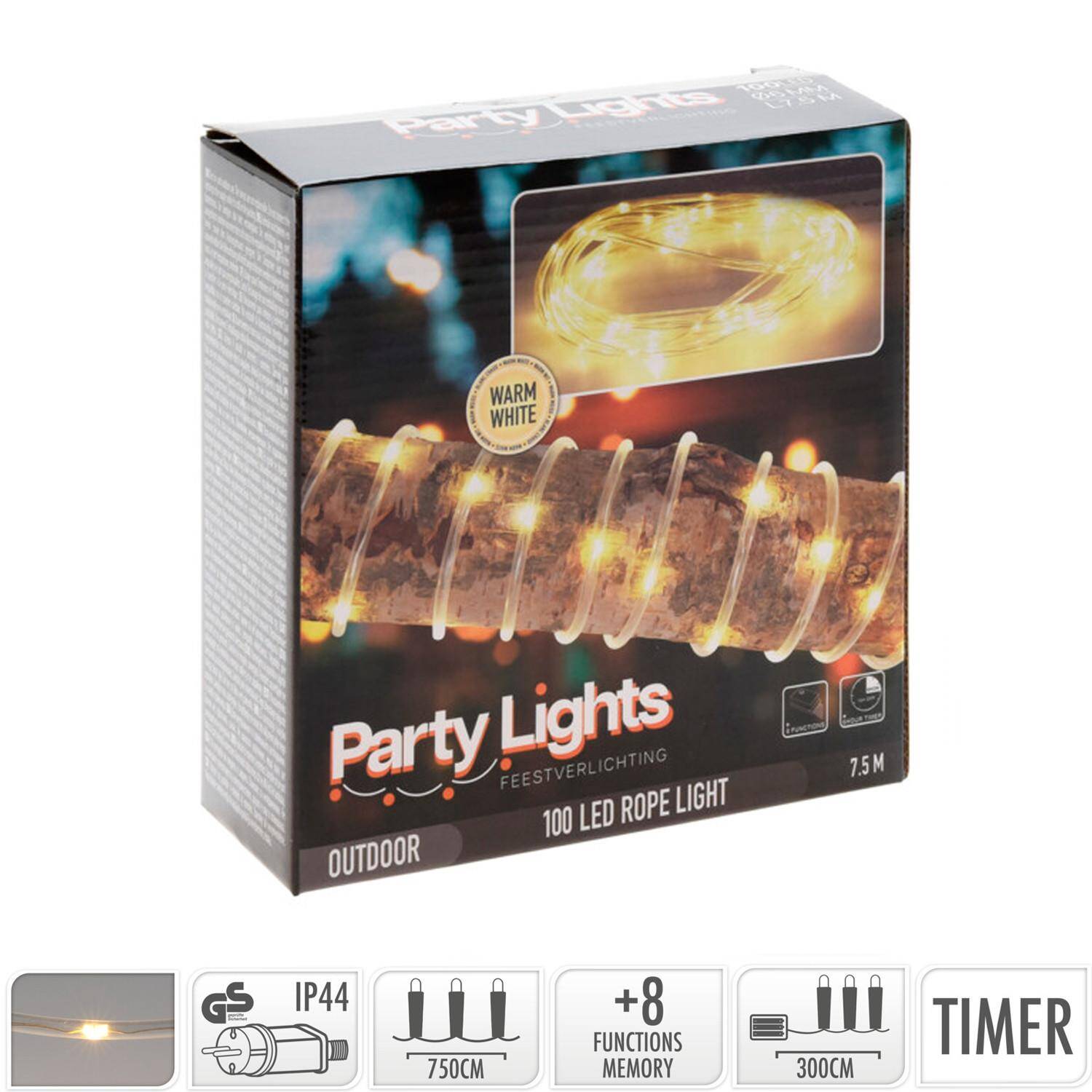 Le tube affiche une puissance indiquée de 2.7 W, une température de couleur blanc chaud de 2700K et une durée de vie estimée à 40 000 heures. Le modèle comprend 100 LED réparties sur 7.5 m pour un rendu chaleureux adapté à l'éclairage extérieur décoratif ou d'ambiance.