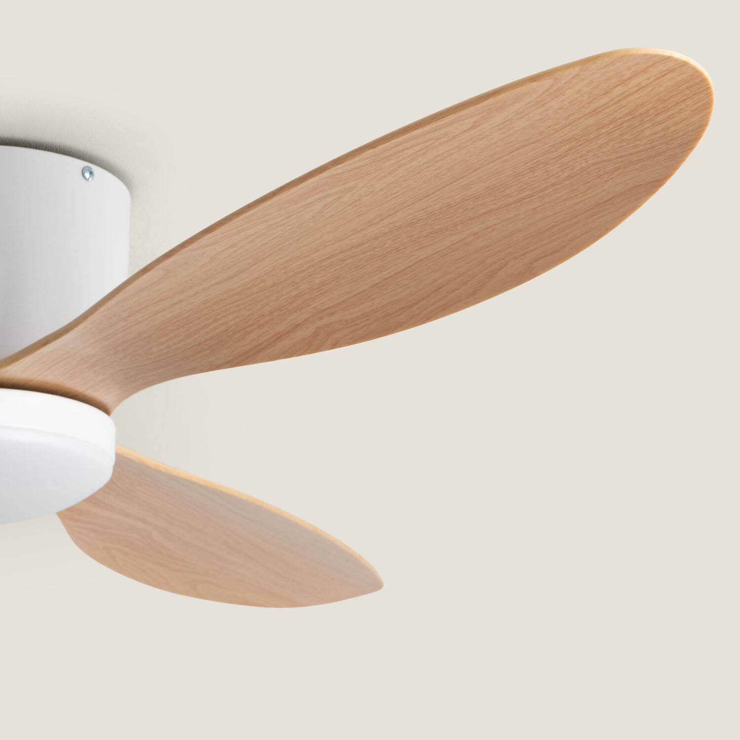 Le contraste blanc/bois apporte une esthétique contemporaine et chaleureuse adaptée aux intérieurs soignés et aux espaces extérieurs protégés. Les pales imitent le bois naturel tandis que la coupole discrète accueille l’éclairage pour un rendu homogène et élégant au plafond, propre aux ambiances haut de gamme.