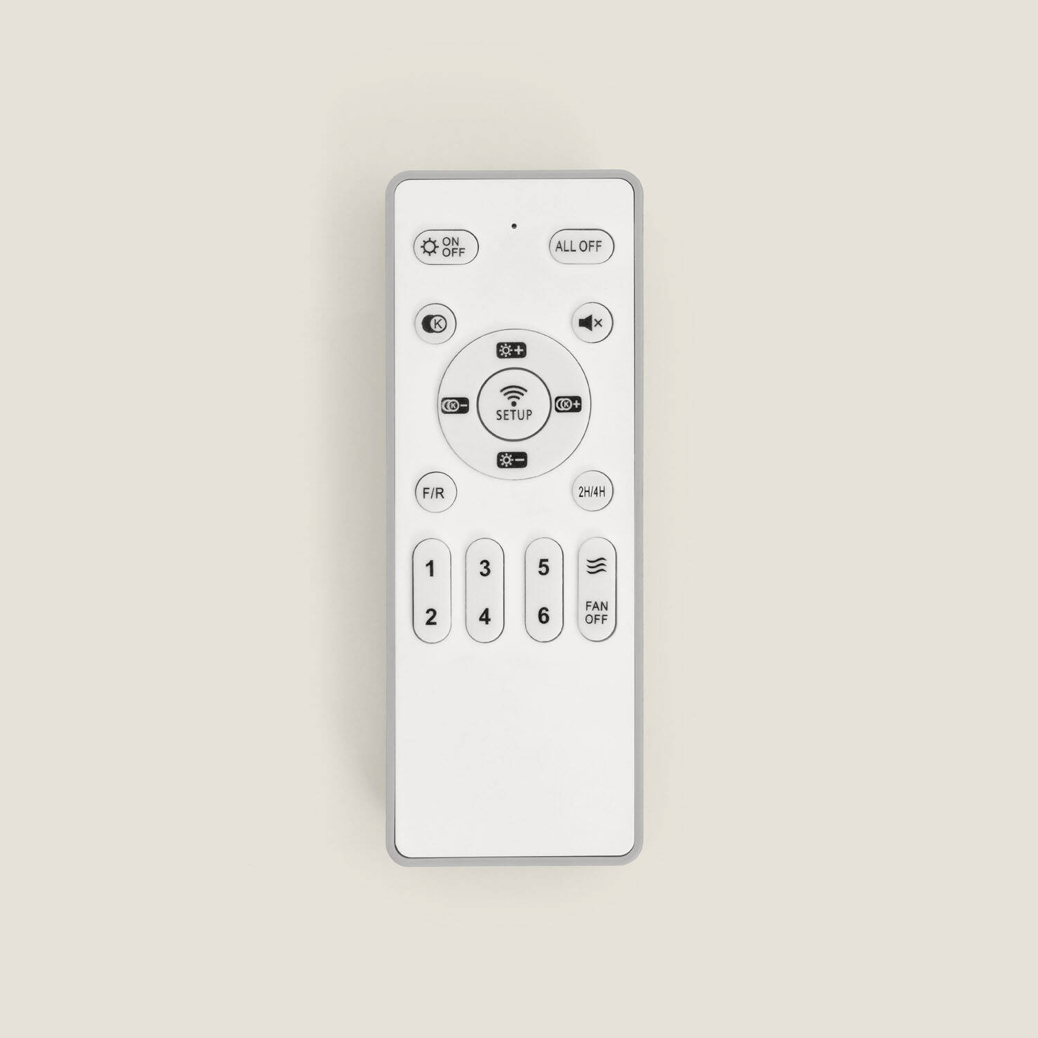 La télécommande fournie permet de piloter les six vitesses, la sélection des températures de couleur et le mode été/hiver pour inverser le flux. Pratique et sécurisée, elle nécessite des piles non incluses et facilite l’ajustement à distance sans intervention au plafond.