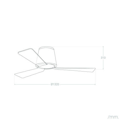 Le modèle se monte en installation surface sur plafond standard. Son diamètre de 1320 mm et sa hauteur totale de 310 mm en font un appareil profilé pour plafonds bas à moyens. Le ventilateur fonctionne sur 220‑240V AC et la pose doit être réalisée par un électricien qualifié pour respecter la sécurité et la compatibilité électrique.