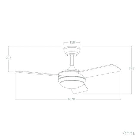 Installation en fixation surface sur boîte électrique standard. Le produit pèse 7,3 kg, a un diamètre de pale de 1070 mm et une hauteur totale de 365 mm. La rosace mesure 60 mm de hauteur et Ø150 mm. La télécommande RF est incluse. Pour une mise en place sécurisée et conforme, il est recommandé de faire appel à un électricien qualifié.